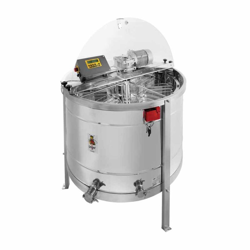16-Waben Selbstwendehonigschleuder, mit Motorantrieb 750W / 230V, vollautomatischer Steuerung und eine eingebaute Sicherheitssperre, die verhindert, dass der Deckel während des Betriebs geöffnet werden kann. Die Wabentaschen in der Honigschleuder sind doppelseitig, zwischen ihnen befindet sich ein Blech, über welches der Honig abfließt. Schleuder hat zwei rostfreie Quetschhahn 2''. Quetschhahn ist am tiefst möglichen Punkt eingebaut, damit der gesamte Honig aus der Honigschleuder abfließen kann. Alle Teile der Honigschleuder, die mit dem Honig in Berührung kommen, bestehen aus lebensmittelzugelassenen Materialien. Der Deckel ist aus durchsichtigem Akrylglas.