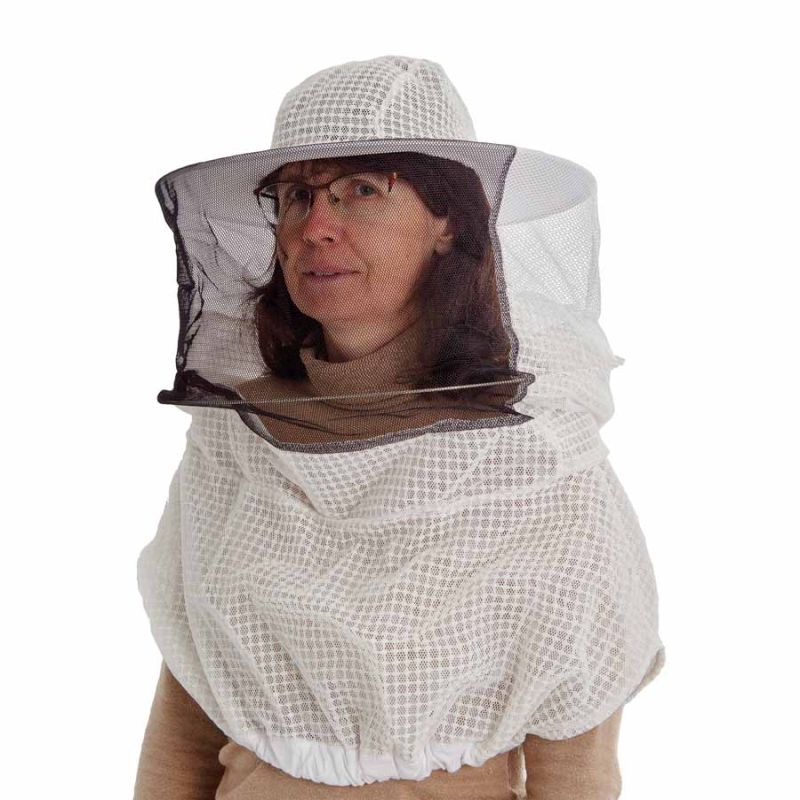 Man trägt den Imker Hut wie eine Weste, am unteren Teil ist ein Gummiband eingenäht, um den Zugang der Bienen zu verhindern.