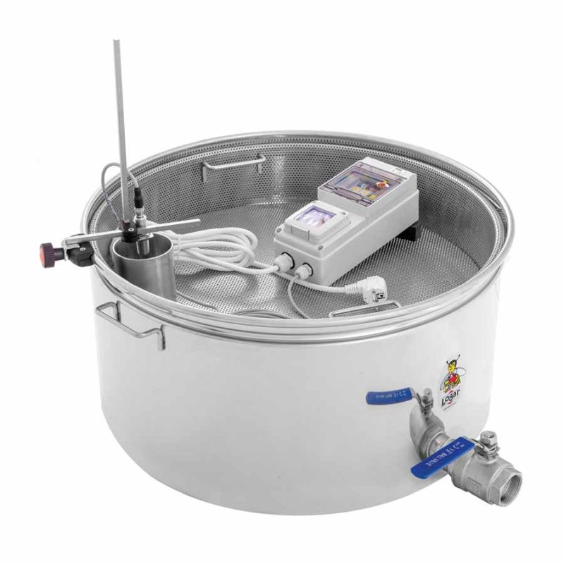 Die robuste Siebkanne ist für die grobe Reinigung von Honig unter den Schleuder und direktes Pumpen in Behälter konzipiert. Der Kugelhahn 6/4'' ermöglicht schnelles Anschließen an die Pumpe. In das Lochblech kann zusätzlich eine Rohröffnung integriert werden, die einen Schwimmer oder einen Sensor zur Steuerung der Pumpe aufnimmt.